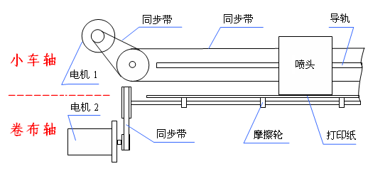 如下圖,噴繪機(jī)的機(jī)械結(jié)構(gòu)為皮帶傳動(dòng),分為小車軸和卷布軸: